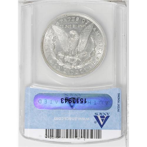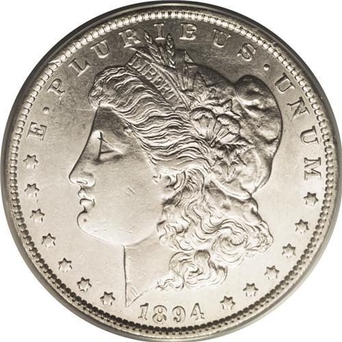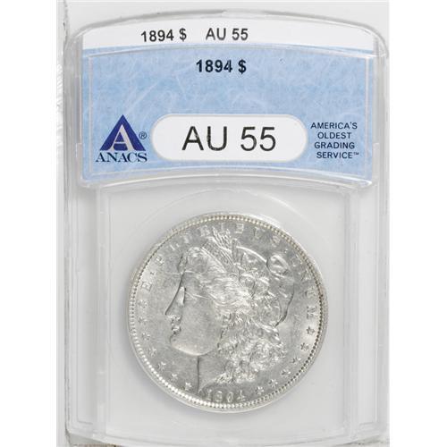 <B>1894<img border='0' src='http://www.heritagecoins.com/images/star.gif' width=10 height=10>$1> AU55 ANACS.</B></I> A nearly untoned example of this low mintage issue, struck after the 1893 repeal of the Sherman Act. The eagle's breast and the hair above the ear display slight friction, and the cartwheel luster is diminished across the open fields, but the sharpness is close to Mint State, and there are no relevant marks. Philadelphia Mint production of Morgan dollars fell dramatically between 1891 and 1895. By 1894, only 110,000 pieces were struck, fewer than any other issue other than the 1893-S and the proof-only 1895.