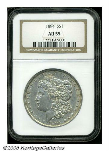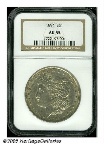 <B>1894<S$1> AU55 NGC.</B></I> Minimally worn for this popular key, with tinges of apricot peripheral toning. A pair of milling marks near Liberty's jaw are useful for identification.
