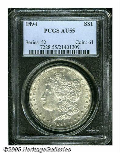 <B>1894<S$1> AU55 PCGS.</B></I> A coin displaying much satin luster despite modest circulation. The fields still shimmer with white-silver color. The designs retain sharp detail from a strong strike, except just above Liberty's ear. The surfaces are lightly abraded for the grade, without any marks worthy of singular mention, and there are only traces of wear on either side of the coin. This is a good opportunity to acquire an attractive example of this important date without paying a Mint State price.