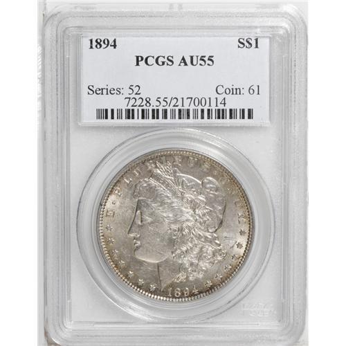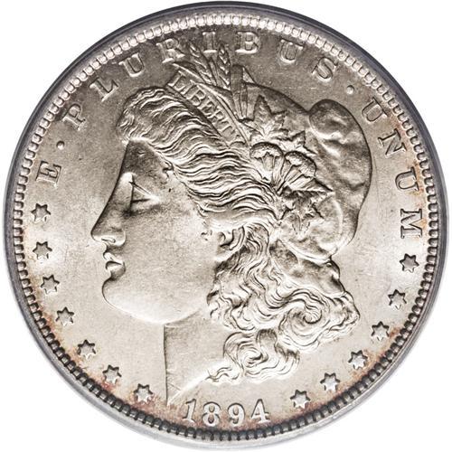 <B>1894<img border='0' src='http://www.heritagecoins.com/images/star.gif' width=10 height=10>$1> AU55 PCGS.</B></I> A lovely near-Mint State example of the rarest P-mint Morgan dollar, excepting the proof-only 1895 issue. This specimen offers silver centers with rims patinated in hues of copper and orange. Considerable luster radiates from the surfaces, and there is scant evidence of contact. An appealingly high-end piece, perhaps deserving a higher grade.<BR><I>From The Tide Collection.</B></I>