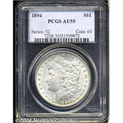 <B>1894<S$1> AU55 PCGS.</B></I> Light-gray toning is to be found on each side of this lightly circulated Morgan dollar. The design elements are generally well struck, save for softness in some of Liberty's hair strands, and on the eagle's breast and legs. A few very light abrasions are noted, none of which are singularly important. Wispy slide marks are apparent on Liberty's cheek. <BR><BR><B>Important notice:</B> Heritage usually auctions material at the rate of 200-250 lots per hour. On some occasions eBay Live bid software or the Internet may not be able to keep up with the pace of the auction. We recommend placing a realistic absentee bid now as insurance to avoid disappointment. Occasionally the auctioneer may eliminate or reject an eBay Live bid, and the auctioneer may also reopen a lot after the close of the eBay live bidding (usually because we missed an audience bid), and may reject your bid even if it shows you as the winning bidder. By bidding via eBay Live, you agree that Heritage may award the lot to another bidder at its sole discretion under the circumstances described above or any other reasonable circumstances. Since eBay bids are not shown to us until we open the lot on the floor, we treat those bids just like floor bids. In most cases the floor responds before the eBay bid is presented to us, due to Internet lag time, so for consistency we have made it a policy that floor bids are always considered first over tie eBay live bids. Also please note that all Heritage lots purchased through eBay Live carry a 20% Buyer's Premium. Please make sure you read the Terms and Conditions before you bid. </span></font></tr></table></td></tr></table>