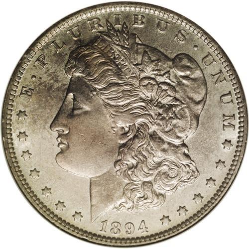 <B>1894<img border='0' src='http://www.heritagecoins.com/images/star.gif' width=10 height=10>$1> AU58 ANACS.</B></I> Just the slightest trace of friction keeps this piece from the Mint State category. Well, but not fully struck, the surfaces are remarkably clean with the exception of an angling mark across the eagle's breast. Lilac-rose patina is seen over each side, but more brightness is present on the reverse.