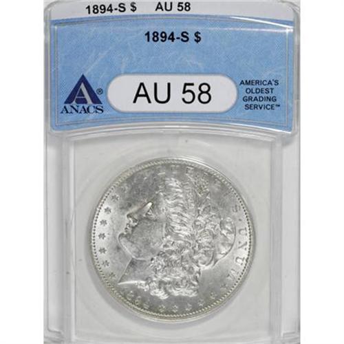 <B>1894-S $1 AU58 ANACS.</B></I> NGC Census: (128/1399). PCGS Population (131/2623). Mintage: 1,260,000. Numismedia Wsl. Price for NGC/PCGS coin in AU58: $425. (#7232)<BR><BR><B>Coin Engraver:</B> George T. Morgan<BR><BR><b>Shipping:</b> Coins & Currency (<a target="_blank" href="http://www.heritageauctions.com/common/shipping.php">view shipping information</a>)