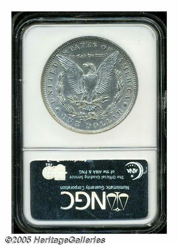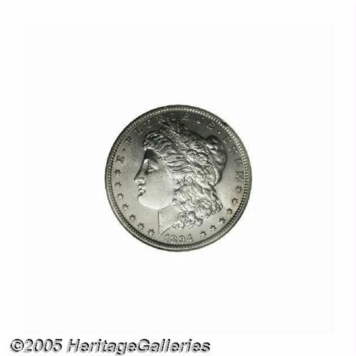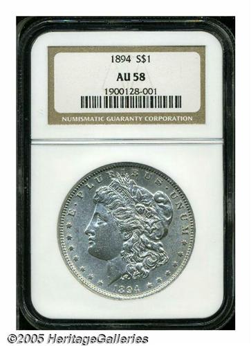 <B>1894<S$1> AU58 NGC.</B></I> The 1894 dollar has the lowest business strike mintage of any Philadelphia Mint issue of the design, except 1895, and is a highly desired coin in all grades. This high-end AU example has silver-gray surfaces that display touches of light tan color in restricted areas. The design elements show excellent definition, except for weakness in the hair above Liberty's ear. The reverse is very well preserved, while just a few inoffensive marks are noted on the obverse.