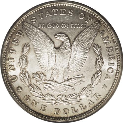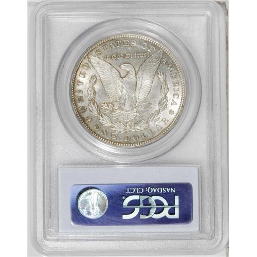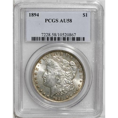 <B>1894<img border='0' src='http://www.heritagecoins.com/images/star.gif' width=10 height=10>$1> AU58 PCGS.</B></I> A small trace of friction keeps this lustrous coin from Mint State, though the friction blends with a weak strike and it is plausible that this example traded as Mint State in the past. Mustard-yellow toning appears at the obverse periphery, though the rest of the coin has only mellow dove-gray patina.