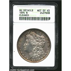 1894 S$1--Cleaned--ANACS. AU Details, Net XF45. The borders have attractive golden-brown patina. A bold representative, but both sides have numerous hairlines and an occasional hint of granularity. The 1894 Morgan Dollar has one of the lowest mintages in the series, and it is also among the scarcest issues in Uncirculated grades. Important notice: We expect to be auctioning lots at the rate of 200-250 per hour. Sometimes eBay Premier live bid software cannot keep up with that pace, so we strongly recommend that you place a realistic proxy bid now as insurance to avoid disappointment. Also please note that all Heritage/CAA lots purchased through eBay Premier carry a 20% Buyer's Premium. Please make sure you read the Terms and Conditions.
