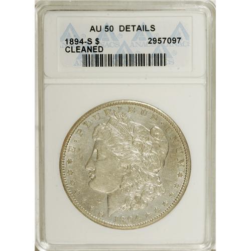 <B>1894-S $1 --Cleaned--ANACS. AU50 Details.</B></I> NGC Census: (32/1568). PCGS Population (55/2871). Mintage: 1,260,000. Numismedia Wsl. Price: $283. (#7232)<BR><BR><b>Shipping:</b> Coins & Currency (<a target="_blank" href="http://www.heritageauctions.com/common/shipping.php">view shipping information</a>)
