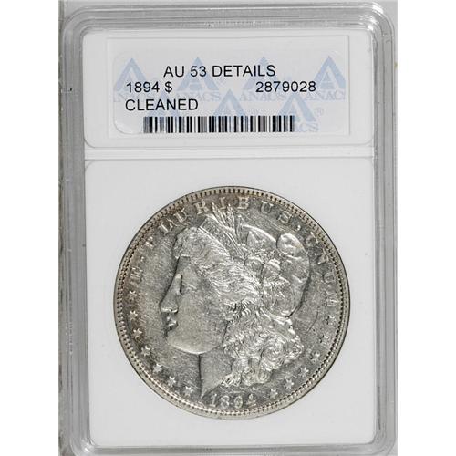 <B>1894<img border='0' src='http://www.heritagecoins.com/images/star.gif' width=10 height=10>$1>--Cleaned--ANACS. AU53 Details.</B></I> Traces of this coin's former semiprooflike reflectivity appear at the periphery. A lightly worn and well struck piece.