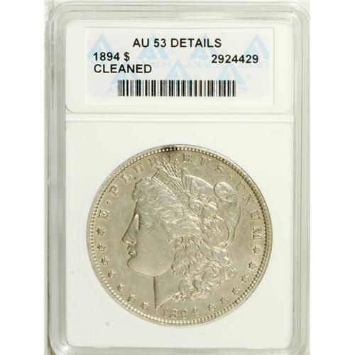 <B>1894 S$1 --Cleaned--ANACS. AU53 Details.</B></I> Well struck and lightly worn with scattered abrasions on the strangely bright surfaces. A spot of reddish-gray toning near 12 o'clock on the obverse is joined by three smaller spots on the reverse.<BR><BR><b>Shipping:</b> Coin/Currency (<a target="_blank" href="http://www.heritageauctions.com/common/shipping.php">view shipping information</a>)