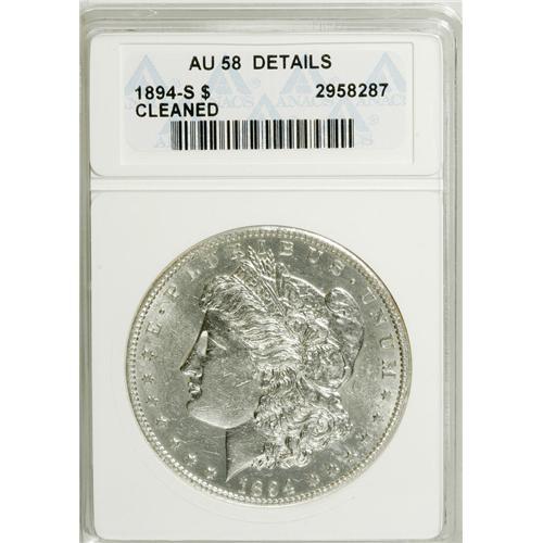 <B>1894-S $1 --Cleaned--ANACS. AU58 Details.</B></I> NGC Census: (117/1360). PCGS Population (124/2573). Mintage: 1,260,000. Numismedia Wsl. Price: $342. (#7232)<BR><BR><b>Shipping:</b> Coins & Currency (<a target="_blank" href="http://www.heritageauctions.com/common/shipping.php">view shipping information</a>)