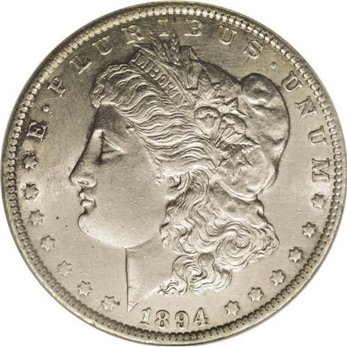 <B>1894<img border='0' src='http://www.heritagecoins.com/images/star.gif' width=10 height=10>$1>--Cleaned--ANACS. Unc Details, Net AU55.</B></I> Silver-gray surfaces reveal faint hints of light tan under magnification, along with fine hairlines that are a bit more prominent on the obverse. Generally good strike definition, though the hair over Liberty's ear is a tad soft. A few light contact marks are noted on each side. Not a bad coin, despite the relatively light cleaning.