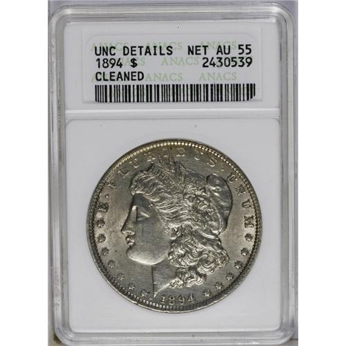 1894 S$1 --Cleaned--ANACS. Unc Details, Net AU55. Silve