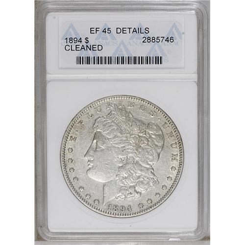 <B>1894<img border='0' src='http://www.heritagecoins.com/images/star.gif' width=10 height=10>$1>--Cleaned--ANACS. XF45 Details.</B></I> An unnaturally glossy pearl-gray piece lightly worn in a highpoint pattern. Nicely detailed elsewhere with light hairlines over the surfaces.
