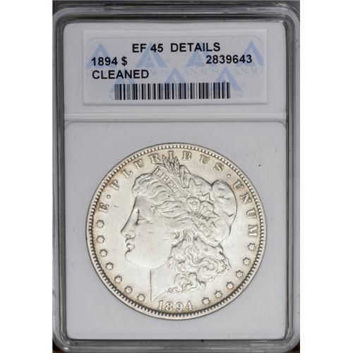 <B>1894<img border='0' src='http://www.heritagecoins.com/images/star.gif' width=10 height=10>$1>--Cleaned--ANACS. XF45 Details.</B></I> Light brown toning visits the borders of this glossy key date dollar. Nicely detailed, with the expected moderate wear on the eagle's breast and the hair above the ear.