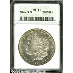 <B>1894-S<img border='0' src='http://www.heritagecoins.com/images/star.gif' width=10 height=10>$1 MS61 ANACS.</B></I> The mostly brilliant surfaces are rendered even brighter by the presence of heavy die striations in the fields. Fully struck with a few abrasions scattered over each side.
