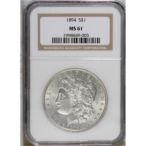 <B>1894 S$1 MS61 NGC.</B></I> This untoned and lustrous rare date dollar has fewer abrasions than usual for the grade. The cheek is particularly smooth, and the fields are also clean despite moderate marks above the arrowheads. The business strike mintage for the 1894 is comparable with the series key 1893-S, although more examples of the 1894 were set aside.<BR><BR><b>Shipping:</b> Coin/Currency (<a target="_blank" href="http://www.heritageauctions.com/common/shipping.php">view shipping information</a>)