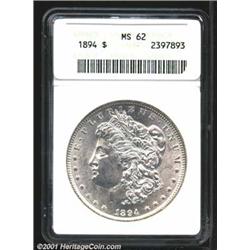 1894 S$1 MS62 ANACS. Sharply struck with brilliant surfaces and very good luster. A nice coin with an especially clean reverse. A popular low mintage date. Important notice: We expect to be auctioning lots at the rate of 200-250 per hour. Sometimes eBay Premier live bid software cannot keep up with that pace, so we strongly recommend that you place a realistic proxy bid now as insurance to avoid disappointment. Also please note that all Heritage/CAA lots purchased through eBay Premier carry a 20% Buyer's Premium.