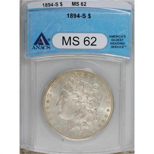 <B>1894-S $1 MS62 ANACS.</B></I> NGC Census: (343/843). PCGS Population (594/1747). Mintage: 1,260,000. Numismedia Wsl. Price for NGC/PCGS coin in MS62: $620. (#7232)<BR><BR><B>Coin Engraver:</B> George T. Morgan<BR><BR><b>Shipping:</b> Coins & Currency (<a target="_blank" href="http://www.heritageauctions.com/common/shipping.php">view shipping information</a>)