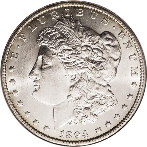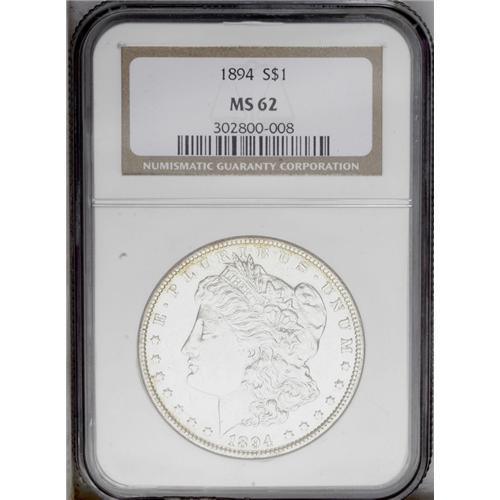 <B>1894<img border='0' src='http://www.heritagecoins.com/images/star.gif' width=10 height=10>$1> MS62 NGC.</B></I> An attractive Mint State representative that benefits from bright, satiny luster and tinges of golden peripheral color. With price levels advancing for XF and AU pieces over the past few years, the acquisition of a far more challenging Uncirculated example of this low mintage P-mint seems to be a much better value. <BR><BR><B>Important notice:</B> Heritage usually auctions material at the rate of 200-250 lots per hour. On some occasions eBay Live bid software or the Internet may not be able to keep up with the pace of the auction. We recommend placing a realistic absentee bid now as insurance to avoid disappointment. Occasionally the auctioneer may eliminate or reject an eBay Live bid, and the auctioneer may also reopen a lot after the close of the eBay live bidding (usually because we missed an audience bid), and may reject your bid even if it shows you as the winning bidder. By bidding via eBay Live, you agree that Heritage may award the lot to another bidder at its sole discretion under the circumstances described above or any other reasonable circumstances. Since eBay bids are not shown to us until we open the lot on the floor, we treat those bids just like floor bids. In most cases the floor responds before the eBay bid is presented to us, due to Internet lag time, so for consistency we have made it a policy that floor bids are always considered first over tie eBay live bids. Also please note that all Heritage lots purchased through eBay Live carry a 20% Buyer's Premium. Please make sure you read the Terms and Conditions before you bid. This lot is being auctioned in conjunction with a live floor auction by Heritage Galleries & Auctioneers. All final auction and invoice information will be supplied by Heritage Galleries & Auctioneers, and all other information should be considered preliminary. Lot:3660 <BR><BR><B>Winning Notification and Billing:</B> After the FINAL session in this auction is complete, Heritage will send e-mail and snail mail invoices. This process normally takes several days. All final auction and invoice information will be supplied by Heritage Galleries & Auctioneers, and all other information should be considered preliminary. <BR><BR>This auction will be conducted on a live auction floor and over the Internet through eBay Live. If you choose to place an absentee bid, please take a moment to <font color='#0000ff'><u><a href='http://pages.ebay.com/liveauctions/help/before/laabsentee.html'>learn how eBay Live absentee bidding works</a></u></font><font color='#000000'>