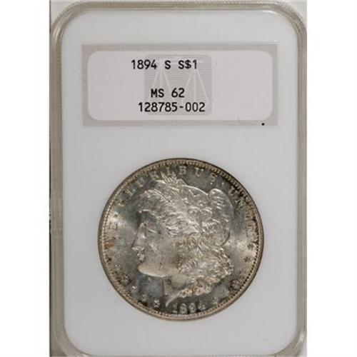 <B>1894-S $1 MS62 NGC.</B></I> Satiny and well struck with attractive silver luster and splashes of golden iridescence. This elusive issue can be decidedly difficult to locate when one is needed or desired.<BR><BR><B>Coin Engraver:</B> George T. Morgan<BR><BR><b>Shipping:</b> Coins & Currency (<a target="_blank" href="http://www.heritageauctions.com/common/shipping.php">view shipping information</a>)