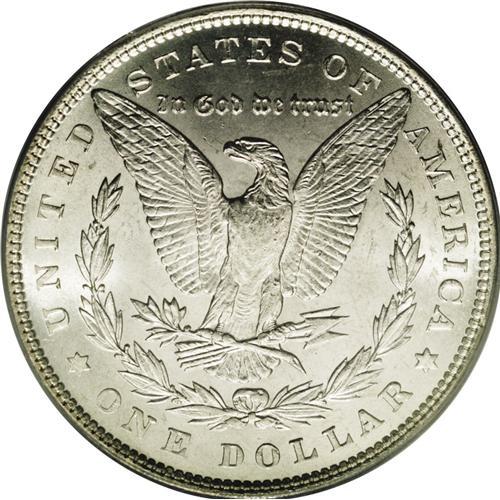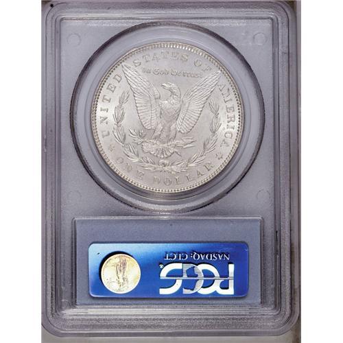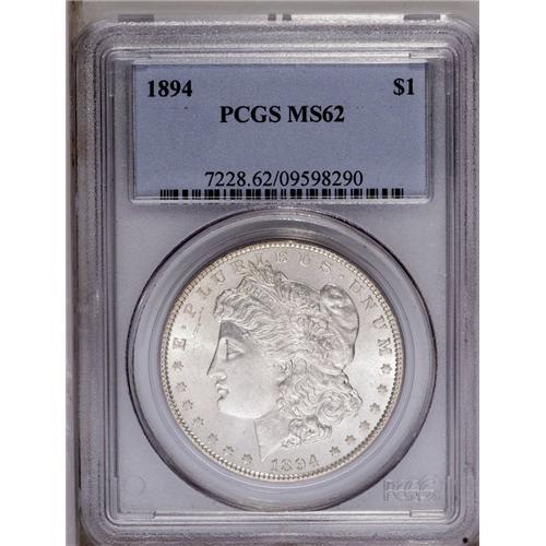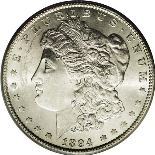<B>1894<img border='0' src='http://www.heritagecoins.com/images/star.gif' width=10 height=10>$1> MS62 PCGS.</B></I> The 1894 has the lowest business strike mintage of any Philadelphia Mint issue of the design, except for 1895. The surfaces are somewhat frosty and bright, and exhibit sharply struck design elements, though the hair over Liberty's ear is a tad soft. Luster grazes are visible in the left (facing) obverse field, and minute contact marks occur on the cheek and neck.