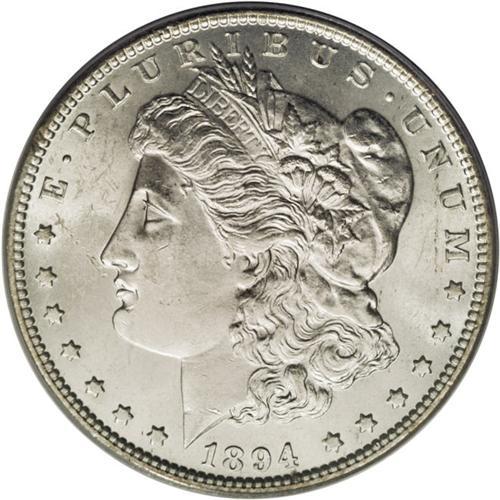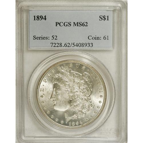 <B>1894 S$1 MS62 PCGS.</B></I> The surfaces are brilliant on this example of the first P-mint key date in the Morgan dollar series. A couple of reeding marks on Liberty's cheek and in the left obverse field noted under a loupe determine the grade, yet the appeal of this piece is clear. Since high-grade circulated examples sell for significant portions of the Mint State price, this attractive coin represents a compelling alternative to an XF or AU piece.<BR><BR><b>Shipping:</b> Coins & Currency (<a target="_blank" href="http://www.heritageauctions.com/common/shipping.php">view shipping information</a>)