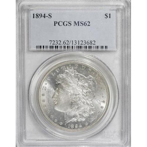 <B>1894-S $1 MS62 PCGS.</B></I> A lustrous and virtually untoned better date dollar. The cheek is unexpectedly clean for the MS62 level, and the field marks are also minor.<BR><BR><b>Shipping:</b> Coins & Currency (<a target="_blank" href="http://www.heritageauctions.com/common/shipping.php">view shipping information</a>)