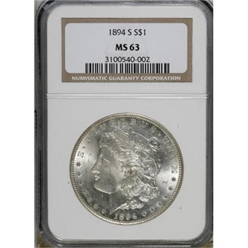 <B>1894-S $1 MS63 NGC.</B></I> NGC Census: (458/400). PCGS Population (967/875). Mintage: 1,260,000. Numismedia Wsl. Price for NGC/PCGS coin in MS63: $925. (#7232)<BR><BR><B>Coin Engraver:</B> George T. Morgan<BR><BR><b>Shipping:</b> Coins & Currency (<a target="_blank" href="http://www.heritageauctions.com/common/shipping.php">view shipping information</a>)
