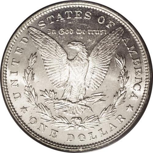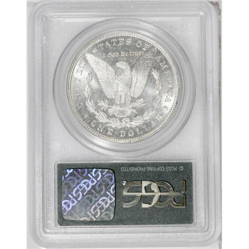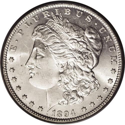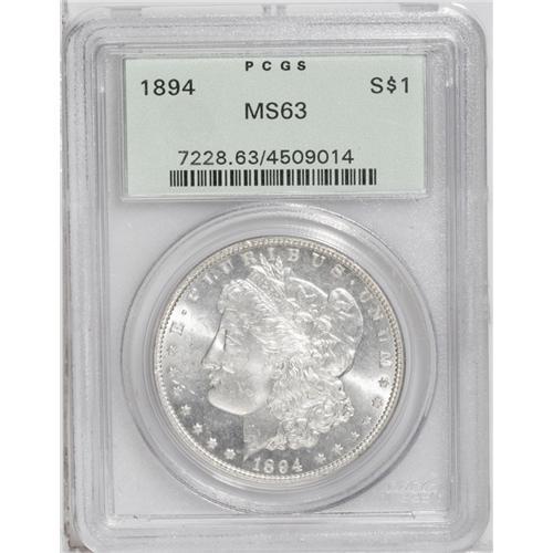 <B>1894<img border='0' src='http://www.heritagecoins.com/images/star.gif' width=10 height=10>$1> MS63 PCGS.</B></I> This '94-P Morgan is completely brilliant and has enough reflectivity in the fields to place it on the verge of Prooflike status. Several chunky abrasions clustered together to the right of Liberty's nose are the primary deterrent to a higher rating. Housed in a PCGS holder with a light-green label.