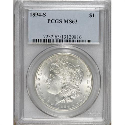 <B>1894-S $1 MS63 PCGS.</B></I> Well struck with excellent definition noted on the hair detail above Liberty's ear and on the eagle's breast feathers. The brilliant white surfaces are highly lustrous. A small charcoal-brown spot rests on Liberty's jawline, and a typical number of scuffy marks are seen for the grade.<BR><BR><b>Shipping:</b> Coins & Currency (<a target="_blank" href="http://www.heritageauctions.com/common/shipping.php">view shipping information</a>)