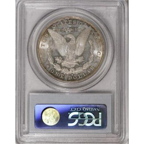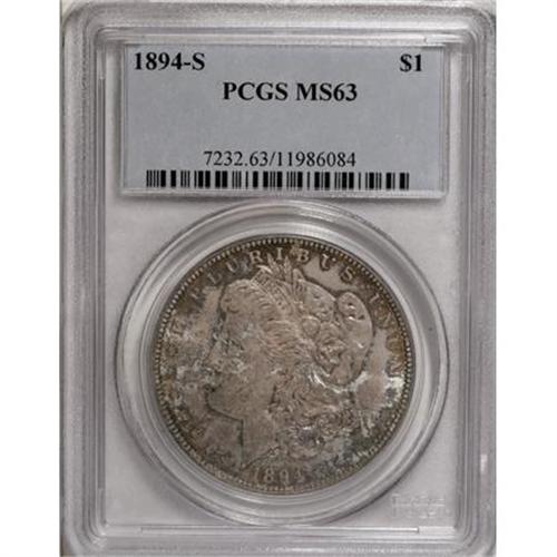 <B>1894-S $1 MS63 PCGS.</B></I> Rich, hazy blue-gray and rose shadings drape the obverse of this Select S-mint coin, while the reverse showcases flashy cartwheel luster beneath intermittent gold-inflected toning. Wonderful eye appeal with few overt marks.<BR><BR><B>Coin Engraver:</B> George T. Morgan<BR><BR><b>Shipping:</b> Coins & Currency (<a target="_blank" href="http://www.heritageauctions.com/common/shipping.php">view shipping information</a>)