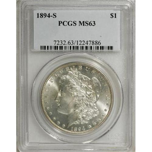 <B>1894-S $1 MS63 PCGS.</B></I> Faint hints of haze visit the shining surfaces, but the overall impression of this highly lustrous piece is one of near-brilliance. Decisively struck with small, scattered abrasions on and around the central devices.<BR><BR><B>Coin Engraver:</B> George T. Morgan<BR><BR><b>Shipping:</b> Coins & Currency (<a target="_blank" href="http://www.heritageauctions.com/common/shipping.php">view shipping information</a>)