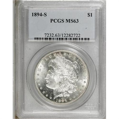 <B>1894-S $1 MS63 PCGS.</B></I> . PCGS Population (960/857). NGC Census: (458/397). Mintage: 1,260,000. Numismedia Wsl. Price for NGC/PCGS coin in MS63: $925. (#7232)<BR><BR><B>Coin Engraver:</B> George T. Morgan<BR><BR><b>Shipping:</b> Coins & Currency (<a target="_blank" href="http://www.heritageauctions.com/common/shipping.php">view shipping information</a>)