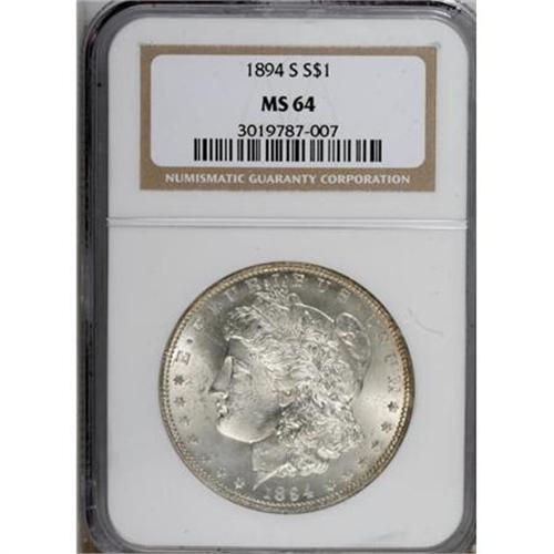 <B>1894-S $1 MS64 NGC.</B></I> Highly lustrous, the mint frost rolls around each side with only minimal impediments from a few light abrasions. Light golden peripheral toning is seen on each side of this better date S-mint. <BR><BR><B>Coin Engraver:</B> George T. Morgan<BR><BR><b>Shipping:</b> Coins & Currency (<a target="_blank" href="http://www.heritageauctions.com/common/shipping.php">view shipping information</a>)