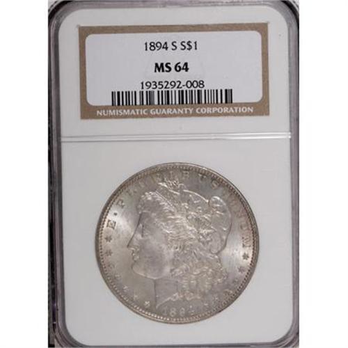 <B>1894-S $1 MS64 NGC.</B></I> The steel-gray toning is modified by occasional splashes of reddish-coral patina on each side. Well struck with full satiny luster and a few trivial marks that keep the piece from a Gem holder. <BR><I>From The Oxford Collection.</B></I><BR><BR><B>Coin Engraver:</B> George T. Morgan<BR><BR><b>Shipping:</b> Coins & Currency (<a target="_blank" href="http://www.heritageauctions.com/common/shipping.php">view shipping information</a>)