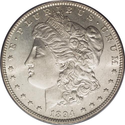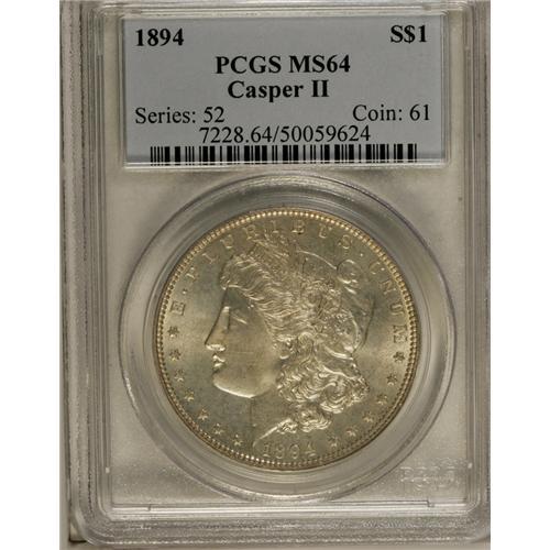 <B>1894 S$1 MS64 PCGS.</B></I> Ex: Casper II. Except for the 1895 issues, the 1894 Philadelphia mint dollars have the lowest mintage of any from that mint. The 1894 is an important, high visibility issue in the Morgan dollar series as only 110,972 pieces were produced. This low mintage is undoubtedly responsible for much of the issue's charm and attraction to collectors. However, it is also an unquestioned condition rarity as well as an absolute rarity with high grade pieces seldom being offered. The devices show razor-sharp definition with complete hair detail over Liberty's ear and full feathers on the eagle's breast. The fields are somewhat reflective and the only marks of note are a small cluster between the eagle's right (facing) wing and the wreath. Lightly and evenly toned over each side.<BR><BR><b>Shipping:</b> Coin/Currency (<a target="_blank" href="http://www.heritageauctions.com/common/shipping.php">view shipping information</a>)