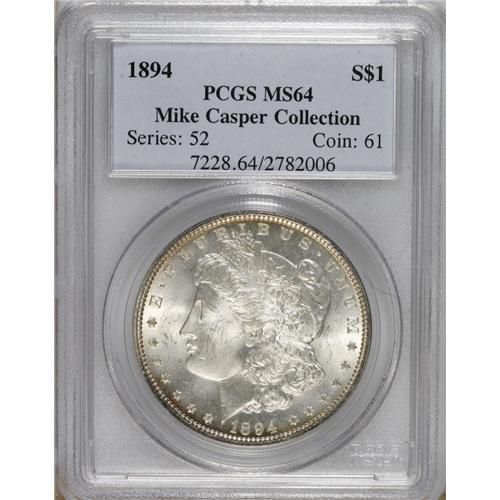 <B>1894 S$1 MS64 PCGS.</B></I> Ex: Mike Casper Collection. Purchased from John Love by Mr. Casper. The striking details are stronger than usually seen; in fact, it they are almost completely struck up in the centers. The surfaces are minimally abraded and almost brilliant with just a hint of golden color over the denticles on the obverse with the usual frosted mint luster. This is an unusual opportunity for the specialist to choose between several high grade '94-P dollars in the same auction. This important coin was hand-selected by one of the best known, old-time dollar dealers and one of the most discriminating collectors of Morgan dollars.<BR><BR><b>Shipping:</b> Coins & Currency (<a target="_blank" href="http://www.heritageauctions.com/common/shipping.php">view shipping information</a>)