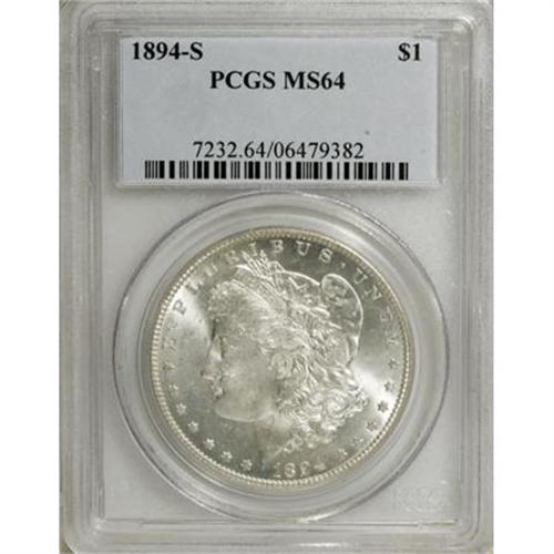 <B>1894-S $1 MS64 PCGS.</B></I> This better date silver dollar has booming luster and pleasantly smooth surfaces. The cheek is especially clean, even for the MS64 level. The centers lack a distinctive strike, but the remainder of the design is bold.<BR><BR><B>Coin Engraver:</B> George T. Morgan<BR><BR><b>Shipping:</b> Coins & Currency (<a target="_blank" href="http://www.heritageauctions.com/common/shipping.php">view shipping information</a>)