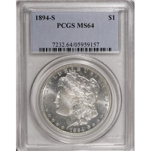 <B>1894-S $1 MS64 PCGS.</B></I> This bright near-Gem 1894-S Morgan is essentially untoned. and displays some prooflike characteristics. Die polish appears in the gleaming fields, though it stops short of the sharply struck, lightly marked devices. An attractive coin.<BR><BR><B>Coin Engraver:</B> George T. Morgan<BR><BR><b>Shipping:</b> Coins & Currency (<a target="_blank" href="http://www.heritageauctions.com/common/shipping.php">view shipping information</a>)