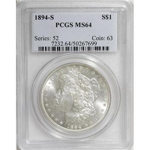 <B>1894-S $1 MS64 PCGS.</B></I> Faint hints of champagne-gold color rest on the lustrous surfaces of this near-Gem. Adequately struck, with just a few minor grade-defining marks. Vertical roller marks are visible in the obverse center.<BR><I>From The Silver Spur Collection of Morgan Dollars.</B></I><BR><BR><B>Coin Engraver:</B> George T. Morgan<BR><BR><b>Shipping:</b> Coins & Currency (<a target="_blank" href="http://www.heritageauctions.com/common/shipping.php">view shipping information</a>)