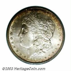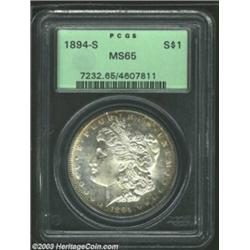 <TR><TD width="100%"><TABLE cellSpacing=1 cellPadding=3 width="100%" border=0><TBODY><TR><TD width="100%" bgColor=#79735c><FONT face=arial color=#ffffff size=3><B>Description</B> </FONT></TD></TR><TR><TD width="100%" bgColor=#ffffff><FONT face=arial size=2><B>1894-S $1 MS65 PCGS.</B></I> The surfaces on this captivating Gem are untoned in the centers and outlined in russet peripheral accents. Myriad die striations in the fields are indicative of a very early striking and give the coin a mirrored finish that could easily be interpreted as fully prooflike. Either way, this is a high quality survivor from an issue that is rarely found as such. </FONT></TD></TR></TBODY></TABLE></TD></TR></TBODY></TABLE><BR><A name=PricesRealized></A><TABLE cellSpacing=0 cellPadding=0 width="100%" bgColor=#000000 border=0><TBODY><TR><TD width="100%"><TABLE cellSpacing=1 cellPadding=3 width="100%" border=0><TBODY><TR><TD width="100%" bgColor=#79735c><A name=PR><FONT face=arial color=#ffffff size=3><B>Previous Prices from Heritage Auctions</B> </FONT></A></TD></TR><TR><TD bgColor=#f6f6ed><TABLE cellSpacing=0 cellPadding=0 width="100%" border=1><TBODY><TR><TD align=middle width="33%"><B>Date</B></TD><TD align=middle width="33%"><B>Service</B></TD><TD align=middle width="33%"><B>Price</B></TD></TR><TR bgColor=whitesmoke><TD width="33%"><B>03/01/2003</B></TD><TD width="33%">PCGS</TD><TD width="33%">$4,255.00</TD></TR><TR bgColor=whitesmoke><TD width="33%"><B>07/30/2002</B></TD><TD width="33%">PCGS</TD><TD width="33%">$4,830.00</TD></TR><TR bgColor=whitesmoke><TD width="33%"><B>04/27/2002</B></TD><TD width="33%">PCGS</TD><TD width="33%">$4,025.00</TD></TR><TR bgColor=whitesmoke><TD width="33%"><B>04/24/2001</B></TD><TD width="33%">PCGS</TD><TD width="33%">$4,300.00</TD></TR><TR bgColor=whitesmoke><TD width="33%"><B>01/07/2000</B></TD><TD width="33%">PCGS</TD><TD width="33%">$3,795.00</TD></TR><TR bgColor=whitesmoke><TD width="33%"><B>09/13/1997</B></TD><TD width="33%">PCGS</TD><TD width="33%">$4,600.00</TD></TR><TR bgColor=whitesmoke><TD width="33%"><B>03/13/1999</B></TD><TD width="33%">PCGS</TD><TD width="33%">$4,600.00</TD></TR><TR bgColor=whitesmoke><TD width="33%"><B>08/19/1995</B></TD><TD width="33%">PCGS</TD><TD width="33%">$3,630.00</TD></TR><TR bgColor=whitesmoke><TD width="33%"><B>12/09/1994</B></TD><TD width="33%">PCGS</TD><TD width="33%">$2,860.00</TD></TR><TR bgColor=whitesmoke><TD width="33%"><B>03/12/1993</B></TD><TD width="33%">PCGS</TD><TD width="33%">$3,080.00</TD></TR><TR bgColor=whitesmoke><TD width="33%"><B>01/01/1995</B></TD><TD width="33%">PCGS</TD><TD width="33%">$2,640.00</TD></TR><TR bgColor=whitesmoke><TD width="33%"><B>09/01/1999</B></TD><TD width="33%">PCGS</TD><TD width="33%">$4,140.00</TD></TR><TR bgColor=whitesmoke><TD width="33%"><B>03/01/2000</B></TD><TD width="33%">PCGS</TD><TD width="33%">$3,508.00</TD></TR><TR bgColor=whitesmoke><TD width="33%"><B>11/01/1999</B></TD><TD width="33%">PCGS</TD><TD width="33%">$3,960.00</TD></TR><TR bgColor=whitesmoke><TD width="33%"><B>01/01/1999</B></TD><TD width="33%">PCGS</TD><TD width="33%">$4,830.00</TD></TR><TR bgColor=whitesmoke><TD width="33%"><B>08/17/1996</B></TD><TD width="33%">NGC</TD><TD width="33%">$2,860.00</TD></TR><TR bgColor=whitesmoke><TD width="33%"><B>05/01/1999</B></TD><TD width="33%">NGC</TD><TD width="33%">$4,370.00</TD></TR><TR bgColor=whitesmoke><TD width="33%"><B>11/01/1998</B></TD><TD width="33%">NGC</TD><TD width="33%">$4,370.00</TD></TR><TR bgColor=whitesmoke><TD width="33%"><B>03/01/1999</B></TD><TD width="33%">NGC</TD><TD width="33%">$4,025.00</TD></TR></TBODY></TABLE></TD></TR><TR><TD bgColor=#ffffff><FONT face=arial size=1 ?>PLEASE NOTE: All prices realized reflect the final hammer price PLUS the buyer's premium in auctions that charge a buyer's premium. Each item has a notation at the top of the listing indicating whether that lot included a buyer's premium. Example: A item that sells with a final hammer price of $100 and a 20% buyer's premium will display with a price realized of $120. All information listed is intended to be as accurate as possible, but errors are possible. Please use this guide carefully and inform us of any inaccuracies. </FONT></TD></TR></TBODY></TABLE></TD></TR></TBODY></TABLE><BR><TABLE cellSpacing=0 cellPadding=0 width="100%" bgColor=#000000 border=0><TBODY><TR><TD width="100%"><TABLE cellSpacing=1 cellPadding=3 width="100%" border=0><TBODY><TR><TD width="100%" bgColor=#79735c colSpan=6><FONT face=arial color=#ffffff size=3><B>Price Guide*</B> </FONT></TD></TR><TR bgColor=#f6f6ed><TD align=middle><B>Grade</B> </TD><TD align=middle><B>Coin World<BR>(Trends)</B> </TD><TD align=middle><B>Numismedia<BR>Retail</B> </TD><TD align=middle><B>Numismedia<BR>Wholesale</B> </TD><TD align=middle><B>Coin<BR>Universe</B> </TD><TD align=middle><B>Heritage<BR>Value Index</B> </TD></TR><TR bgColor=#ffffff><TD align=middle>64</TD><TD align=right>$1,525.00</TD><TD align=right>---</TD><TD align=right>$1,125.00</TD><TD align=right>$1,450.00</TD><TD align=right>$1,011.13</TD></TR><TR style="FONT-WEIGHT: bold" bgColor=#cccfdd><TD align=middle>65</TD><TD align=right>$5,400.00</TD><TD align=right>---</TD><TD align=right>$4,525.00</TD><TD align=right>$5,900.00</TD><TD align=right>$3,880.00</TD></TR><TR bgColor=#ffffff><TD align=middle>66</TD><TD align=right>$11,000.00</TD><TD align=right>---</TD><TD align=right>$8,150.00</TD><TD align=right>$12,000.00</TD><TD align=right>$8,141.67</TD></TR><TR bgColor=#ffffff><TD colSpan=6><FONT size=1>*All information listed is intended to be as accurate as possible, but errors are possible. No item may be returned or refused based on this information which is provided as a service to our customers. You should contact each pricing source directly to determine the accuracy of this information. </FONT></TD></TR></TBODY></TABLE></TD></TR></TBODY></TABLE><BR><TABLE cellSpacing=0 cellPadding=0 width="100%" bgColor=#000000 border=0><TBODY><TR><TD width="100%"><TABLE cellSpacing=1 cellPadd