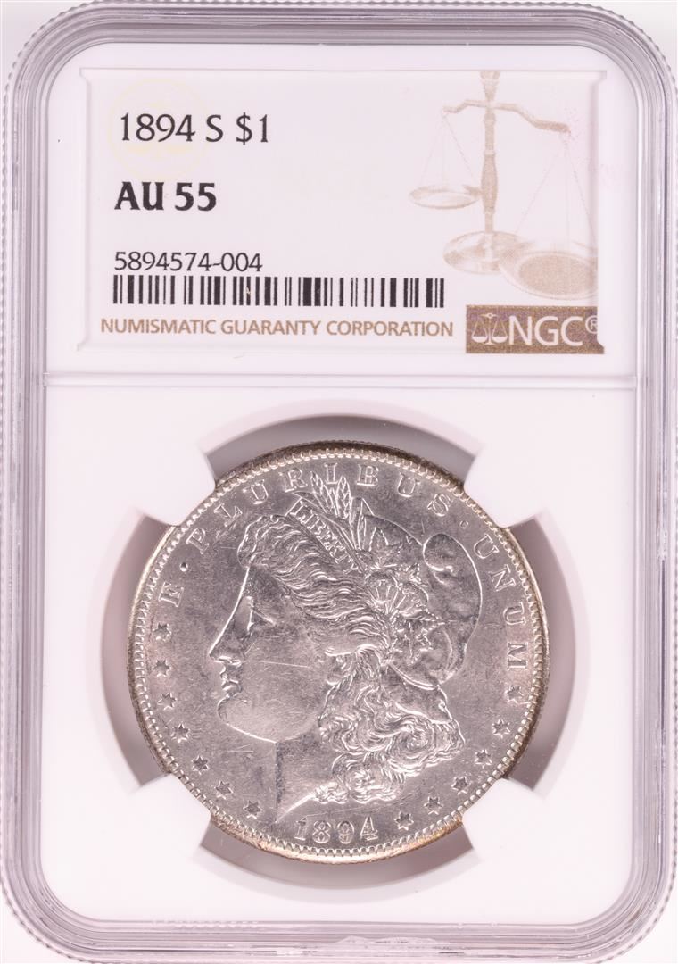 One 1894-S $1 Morgan Silver Dollar Coin NGC AU55. NGC Certified.