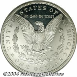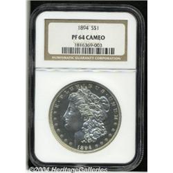 <B>1894<S$1> PR64 Cameo NGC.</B></I> The 1894 proof has always been more eagerly sought after because of the low mintage of only 110,000 business strikes, thus making the few proofs that are available all the more desirable to date collectors. This specimen is brilliant and deeply mirrored, with flashy proof fields on each side. The design elements are moderately frosted, yielding a noticeable contrast between the fields and devices. Sharply struck, the only surface flaw that we can see on this lovely Gem proof is a lengthy, curved strike-through mark (as produced), where the coin was possibly struck through a wire, that essentially bisects the upper portion of the eagle's design. If not for this single mint-made feature, the piece would surely grade at least one point higher. <BR><BR><B>Important notice:</B> Heritage usually auctions material at the rate of 200-250 lots per hour. On some occasions eBay Live bid software or the Internet may not be able to keep up with the pace of the auction. We recommend placing a realistic absentee bid now as insurance to avoid disappointment. Occasionally the auctioneer may eliminate or reject an eBay Live bid, and the auctioneer may also reopen a lot after the close of the eBay live bidding (usually because we missed an audience bid), and may reject your bid even if it shows you as the winning bidder. By bidding via eBay Live, you agree that Heritage may award the lot to another bidder at its sole discretion under the circumstances described above or any other reasonable circumstances. Since eBay bids are not shown to us until we open the lot on the floor, we treat those bids just like floor bids. In most cases the floor responds before the eBay bid is presented to us, due to Internet lag time, so for consistency we have made it a policy that floor bids are always considered first over tie eBay live bids. Also please note that all Heritage lots purchased through eBay Live carry a 20% Buyer's Premium. Please make sure you read the Terms and Conditions before you bid. </span></font></tr></table></td></tr></table>