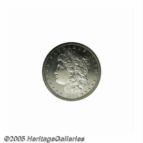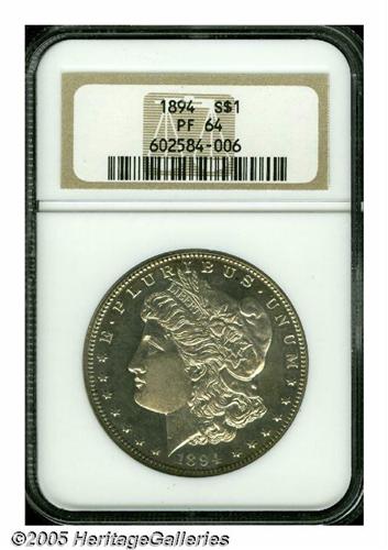 <B>1894<S$1> PR64 NGC.</B></I> The 1894 dollar has always been a collector favorite because it is favorably priced as a high grade proof to a lower-end Uncirculated coin. This is a deeply mirrored coin that shows pinpoint striking details and just the slightest hint of toning on each side. Light hairlining can be seen with magnification, but the unaided eye perceives this as a coin that is much finer than its stated grade.