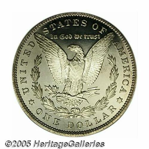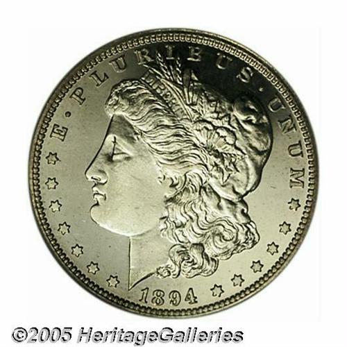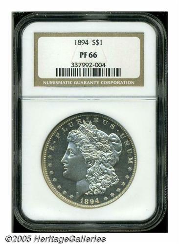 <B>1894<S$1> PR66 NGC.</B></I> Brilliant and especially well mirrored in the fields, with more than enough contrast on the reverse to earn a cameo designation. Apparently the NGC graders felt that the obverse just missed this qualification. The 1894 proof has traditionally commanded a premium over most proof Morgan Dollars because of the scarcity of business strike examples. Population: 39 in 66, 38 finer (5/05).