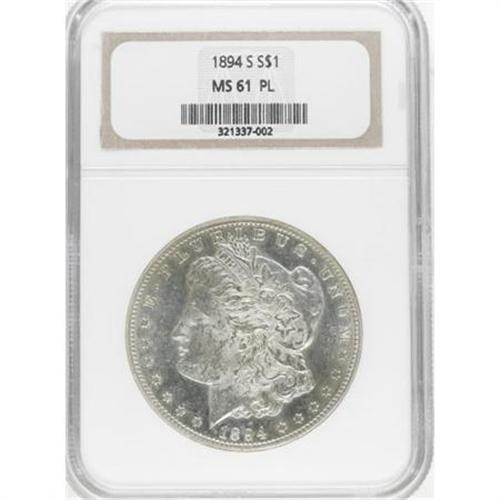 <B>1894-S $1 MS61 Prooflike NGC.</B></I> . NGC Census: (14/104). PCGS Population (15/81). Numismedia Wsl. Price for NGC/PCGS coin in MS61: $500. (#7233)<BR><BR><B>Coin Engraver:</B> George T. Morgan<BR><BR><b>Shipping:</b> Coins & Currency (<a target="_blank" href="http://www.heritageauctions.com/common/shipping.php">view shipping information</a>)