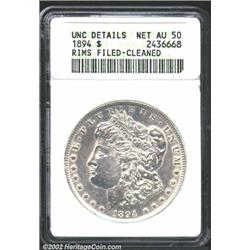 1894 S$1--Rims Filed, Cleaned--ANACS. Unc Details, Net AU50. The extensive bright luster is only broken in the exposed fields. The surfaces are slightly glossy, but the major devices have only the slightest hint of rub. An elusive P-Mint issue. Important notice: We expect to be auctioning lots at the rate of 200-250 per hour. Sometimes eBay Premier live bid software cannot keep up with that pace, so we strongly recommend that you place a realistic proxy bid now as insurance to avoid disappointment. Also please note that all Heritage/CAA lots purchased through eBay Premier carry a 20% Buyer's Premium. Please make sure you read the Terms and Conditions.
