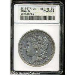 1894 S$1 --Scratched--ANACS. XF Details, Net VF30. <B>1894 S$1 --Scratched--ANACS. XF Details, Net VF30.</B></I> A short and thin but relatively deep horizontal scratch is at 9 o'clock, and the reverse rim has a ding at 4 o'clock. The toughest business strike P-mint Morgan Dollar. <BR><BR><B>Important notice:</B> Heritage usually auctions material at the rate of 200-250 lots per hour. On some occasions eBay Live bid software or the Internet may not be able to keep up with the pace of the auction. We recommend placing a realistic absentee bid now as insurance to avoid disappointment. Occasionally the auctioneer may eliminate or reject an eBay Live bid, and the auctioneer may also reopen a lot after the close of the eBay live bidding (usually because we missed an audience bid), and may reject your bid even if it shows you as the winning bidder. By bidding via eBay Live, you agree that Heritage may award the lot to another bidder at its sole discretion under the circumstances described above or any other reasonable circumstances. Since eBay bids are not shown to us until we open the lot on the floor, we treat those bids just like floor bids. In most cases the floor responds before the eBay bid is presented to us, due to Internet lag time, so for consistency we have made it a policy that floor bids are always considered first over tie eBay live bids. Also please note that all Heritage lots purchased through eBay Live carry a 20% Buyer's Premium. Please make sure you read the Terms and Conditions before you bid. This lot is being auctioned in conjunction with a live floor auction by Heritage Galleries & Auctioneers. All final auction and invoice information will be supplied by Heritage Galleries & Auctioneers, and all other information should be considered preliminary. Lot:7653