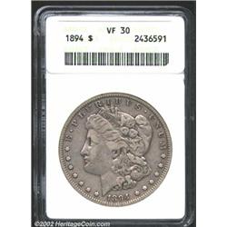 1894 S$1 VF30 ANACS. A silver-gray example that has charcoal patina within the crevices of the devices. Relatively unabraded, and attractive despite 30 points of wear. The scarcest of the Philadelphia business strike issues, if one disregards the proof-only 1895. Important notice: We expect to be auctioning lots at the rate of 200-250 per hour. Sometimes eBay Premier live bid software cannot keep up with that pace, so we strongly recommend that you place a realistic proxy bid now as insurance to avoid disappointment. Also please note that all Heritage/CAA lots purchased through eBay Premier carry a 20% Buyer's Premium. Please make sure you read the Terms and Conditions.