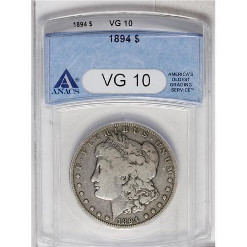 <B>1894<img border='0' src='http://www.heritagecoins.com/images/star.gif' width=10 height=10>$1> VG10 ANACS.</B></I> Displaying full rims and uniform gray color, this is a straightforward VG example of this highly sought-after date.